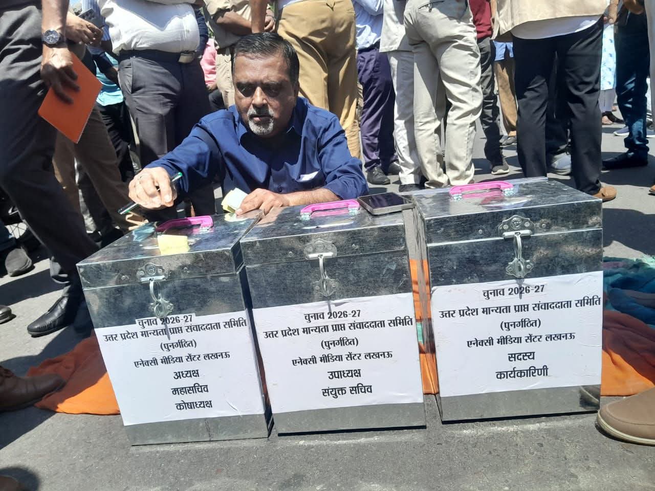 लखनऊ । उत्तर प्रदेश मान्यता प्राप्त संवाददाता समिति (पुनर्गठित) का चुनाव आज संपन्न हुआ। ये चुनाव एनेक्सी मीडिया सेण्टर में होना था लेकिन रात में सरकार के एक उच्च अधिकारी की गोलबंदी के कारण सैकड़ो पत्रकारों को एनेक्सी के गेट के बाहर बीच सडक़ में तप्ती धूप के बीच अपना पहला चुनाव करना पड़ा प्रमुख सचिव सचिवालय प्रशाशन के आदेश के बावजूद एनेक्सी में पत्रकारों के लिए हो रहे चुनाव को बाधित करने के लिए गेट बंद करा दिए गए मजबूरन पत्रकरो को अपना चुनाव सडक़ पर करना पड़ा सभी पत्रकारों ने शांतिपूर्ण ढंग से मतदान में हिस्सा लिया और मतगणना भी सडक़ पर बैठकर करनी पड़ी।