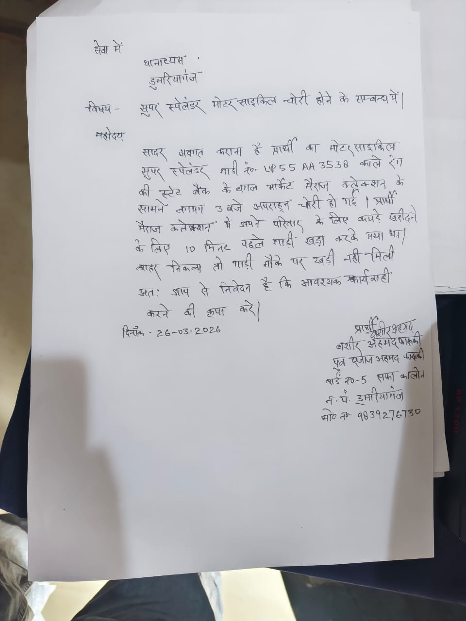 दस दिन में दूसरी बाइक चोरी डुमरियागंज में पुलिस गश्त गायब,चोर बेलगाम,